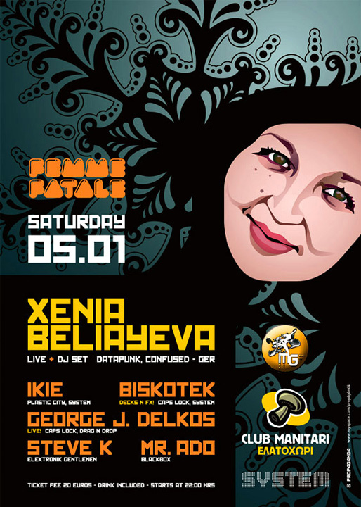 Description | Promotional artwork for an electronic music event in Elatohori (Greece). Guest DJ: Xenia Beliayeva (Datapunk, Confused :: DE) |