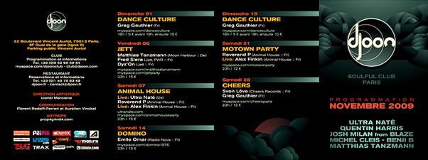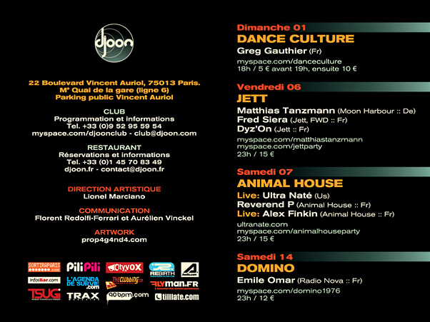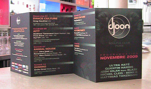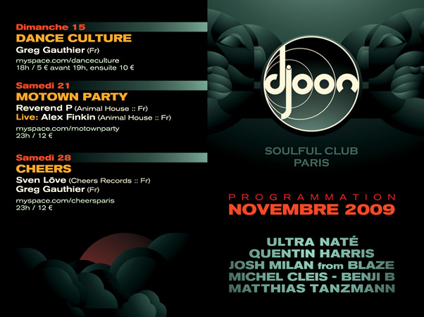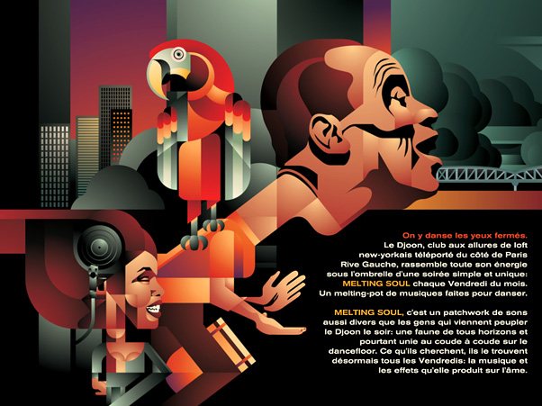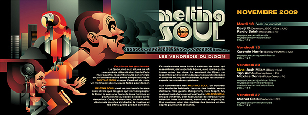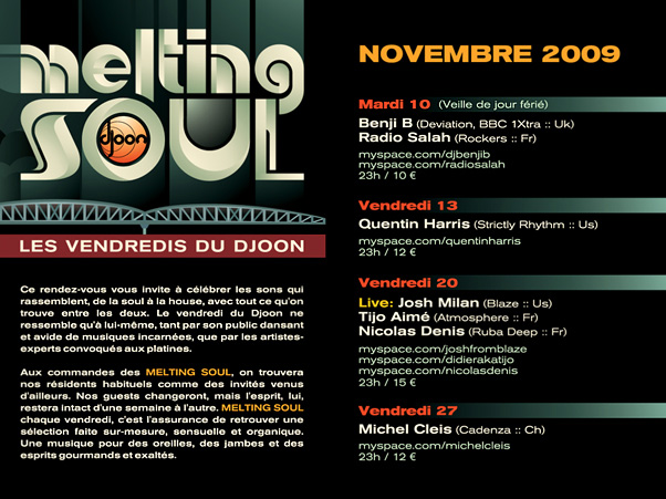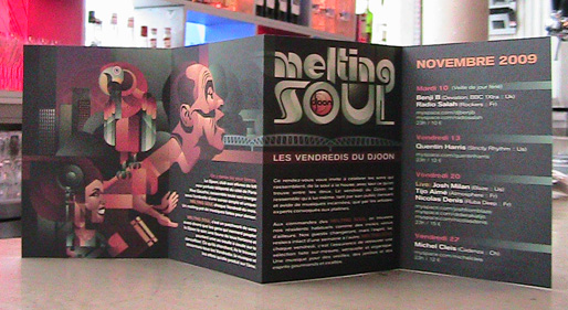 Description | Monthly schedule/booklet for Djoon club in Paris (France). The initial brief was the creation of a special identity for Friday nights at Djoon club. These were meant to be called MELTING SOUL, reminiscent of the Melting Pot name that has been given to metropolitan New York, due to the variety of cultural elements which blend together in the city. The MELTING SOUL brand was particularly asked to be an important point of focus in the visual puzzle of the series, keeping the DJs in a secondary role. This identity was to be applied in monthly posters, flyers, brochures etc. during the season and would express 3 musical paths: Deep House, Soul/Funk/Disco and Afro Caribbean/Latin. |