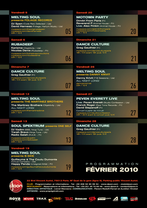 Description | Monthly schedule/booklet for Djoon club in Paris (France). |