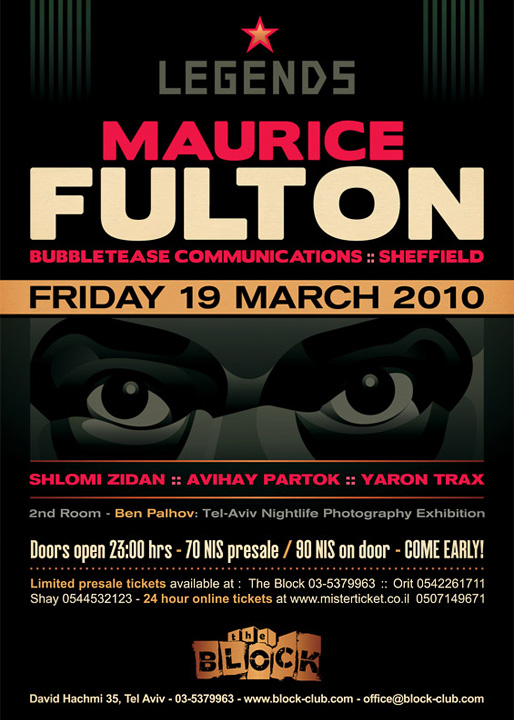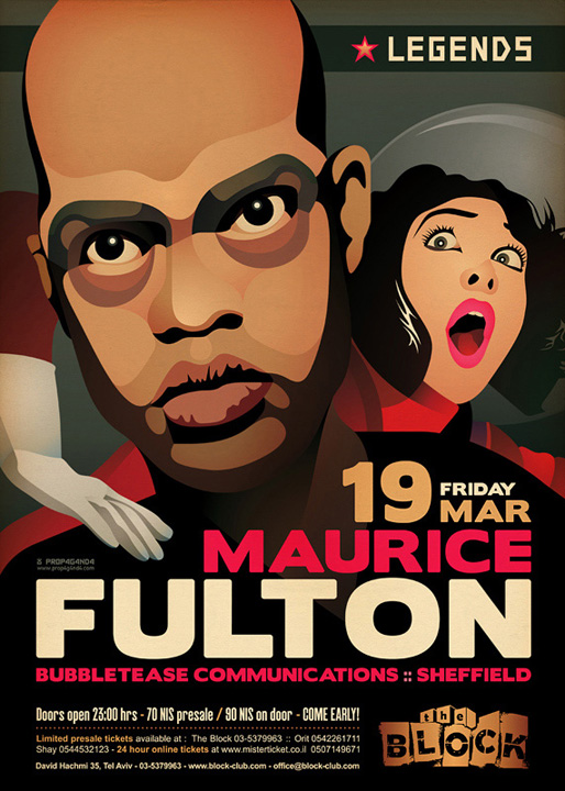 Description | Promotional artwork for an electronic music event in Tel Aviv (Israel). Guest DJ: Maurice Fulton (Bubbletease Communications :: Sheffield). |