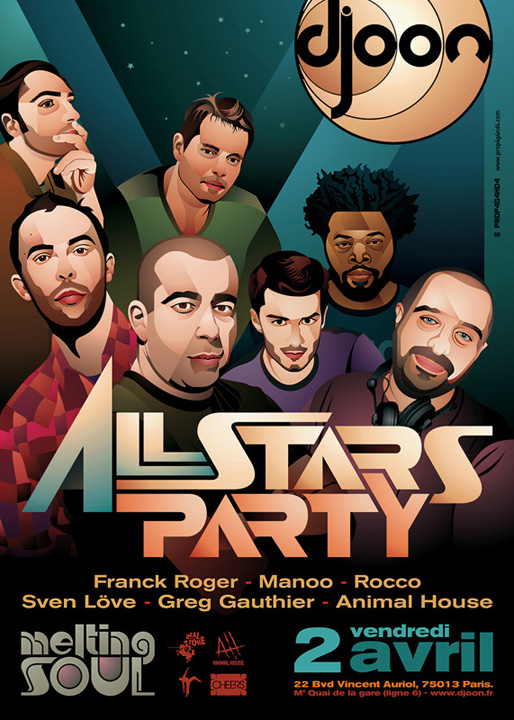 Description | Promotional artwork for an electronic music event in Paris (France). Guest DJs: Franck Roger, Manoo, Rocco, Sven Löve, Greg Gauthier, Animal House. |