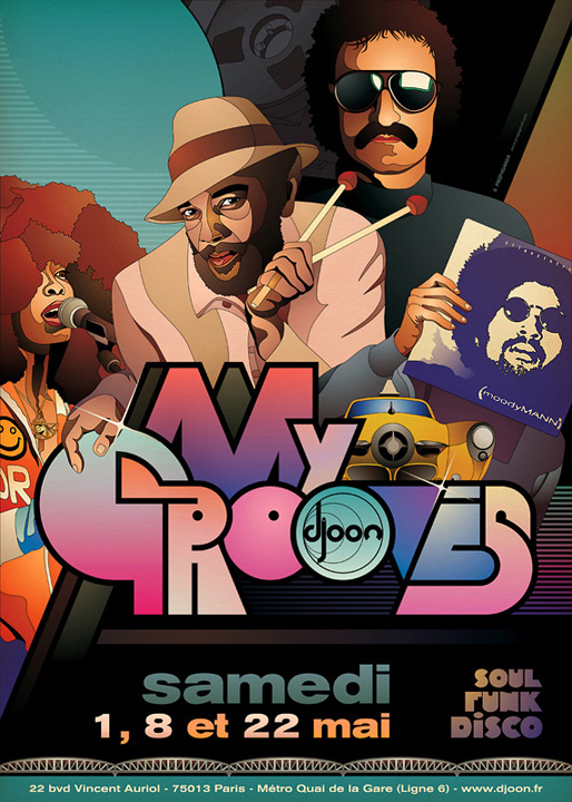 Description | Promotional artwork for a soul/funk/disco music event in Paris (France). From left to right: Erykah Badu, Roy Ayers, Giorgio Moroder, Moodymann. |