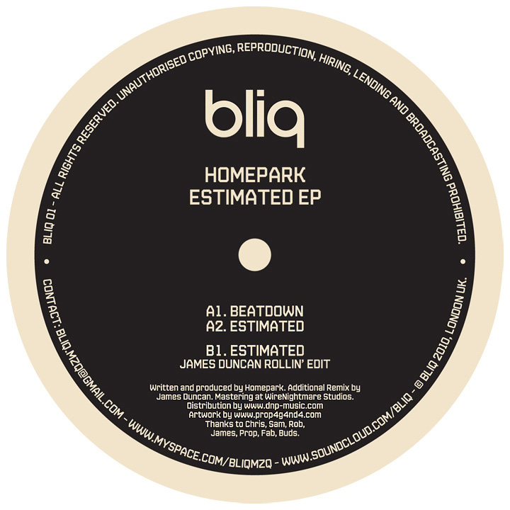 Description | Vinyl Label design for BLIQ 01 release: Homepark - Estimated EP |
