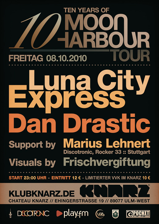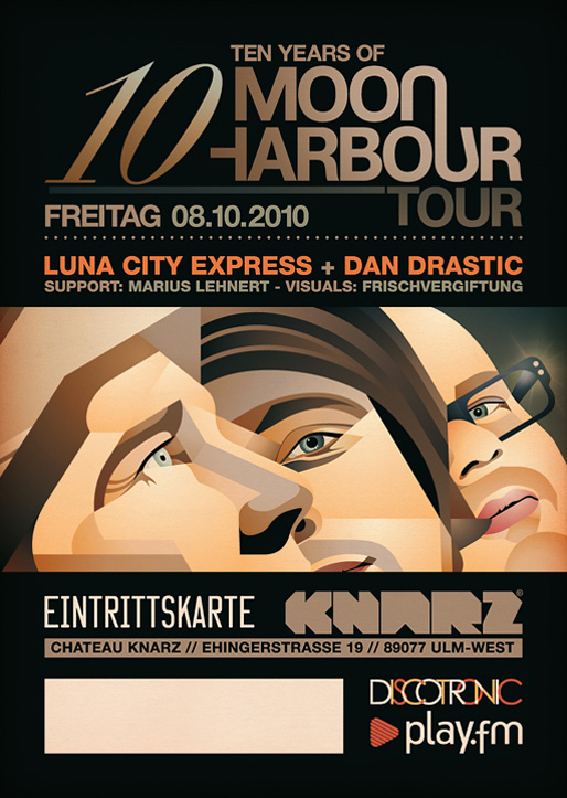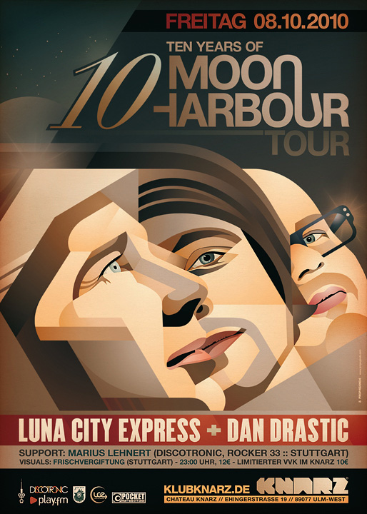Description | Promotional artwork for an electronic music event in Ulm (Germany). Guest DJs: Luna City Express (Berlin), Dan Drastic (Leipzig). |