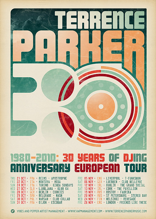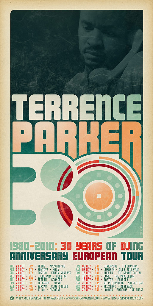 Description | Promotional artwork for the European Tour of DJ Terrence Parker in late 2010. Terrence Parker has reached a great milestone achievement in a career of DJing for 30 years! He has performed as a DJ in more than 150 cities throughout the world. While Terrence continues to release music on his Parker Music Works digital label, he is also known for his incredible DJing (turntablism) skills and his unique signature telephone headset. In addition to DJing and releasing his own music, Terrence has remixed projects for artists on major & independent labels in the USA, Europe, and Japan. |