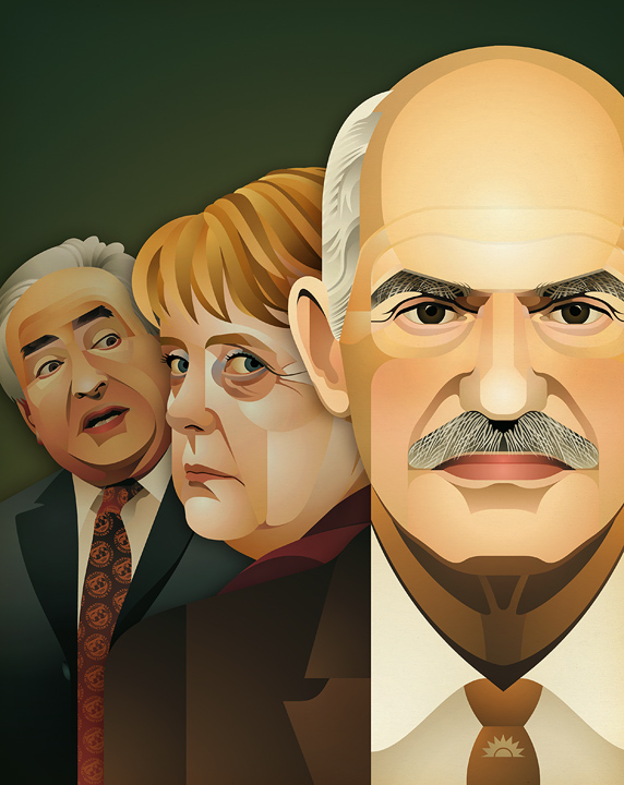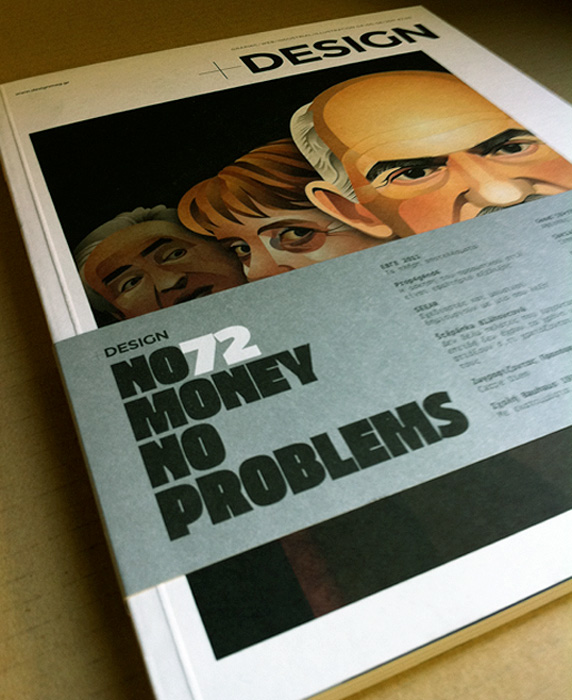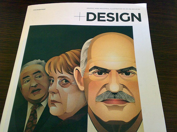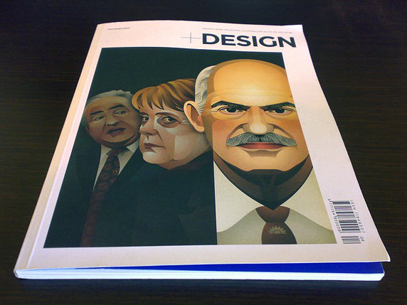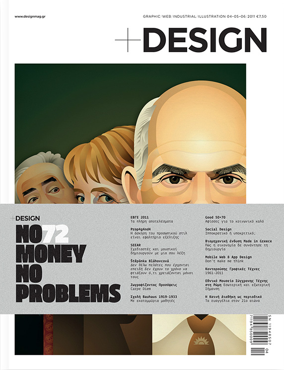 Description | Cover illustration for +DESIGN Magazine (issue 72). The illustration features the Greek prime minister George Papandreou, in front of German chancellor Angela Merkel and (former) chief of the International Monetary Fund, Dominique Strauss-Kahn. All three figures played a prominent role in how the impact of the world economic crisis has evolved in Greece. Issue 72 came with a (removable) slim silver paper band wrapped around it, indicating some basic contents and the catchline "No Money No Problems". The publication this issue almost coincided with the alleged sex-scandal that mr. Strauss-Kahn was involved in, thus adding an extra bit of spice in terms of timing for this illustration. +DESIGN has been around since November 1998, highlighting the best examples of modern production from the fields of graphic/web/industrial design, illustration, advertising and typography. Layout design of the cover, as well as the rest of the magazine by Designers United. |