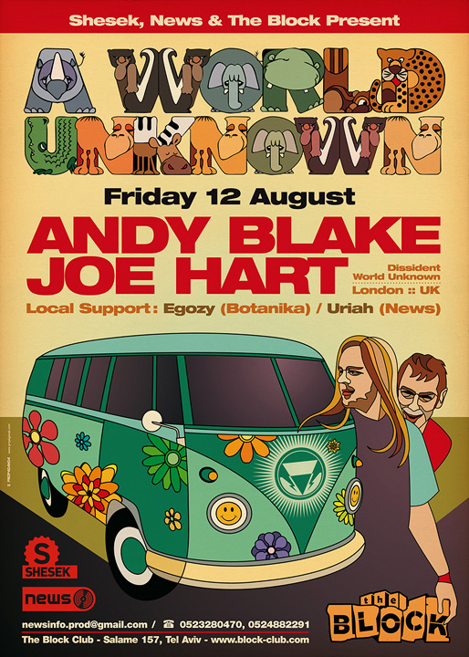 Description | Promotional artwork for an electronic music event in Tel Aviv (Israel). Guest DJs: Andy Blake & Joe Hart (Dissident, WU :: London). |
