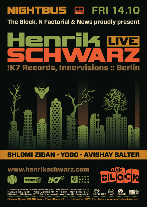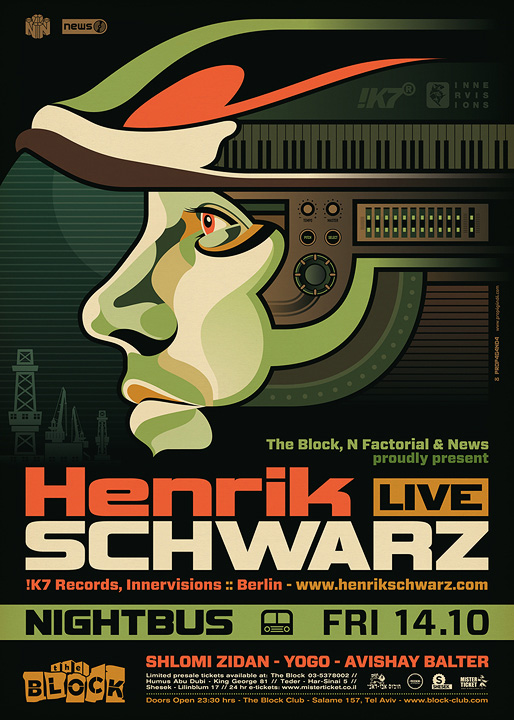 Description | Promotional artwork for an electronic music event in Tel Aviv (Israel). Live: Henrik Schwarz (!K7 Records, Innervisions :: Berlin). |