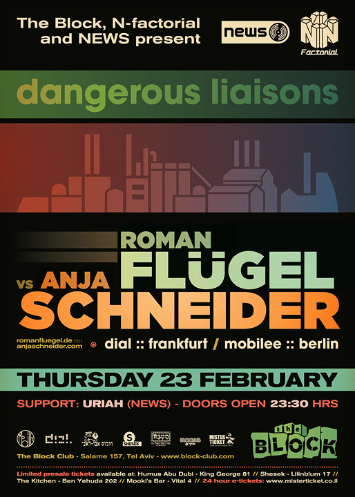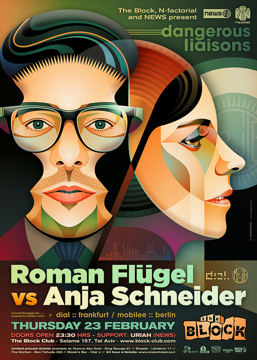 Description | Promotional artwork for an electronic music event in Tel Aviv (Israel). Guest DJs: Roman Flügel (Dial :: Frankfurt), Anja Schneider (Mobilee :: Berlin) |