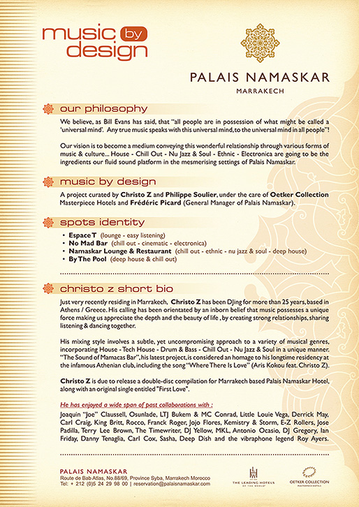 Description | Palais Namaskar luxury hotel (Marrakech, Morocco) - Info brochure for Christo Z's "Music by Design" project. |