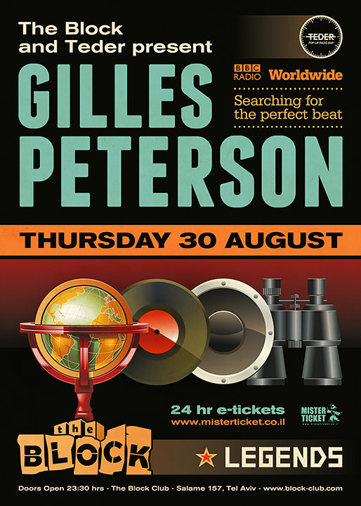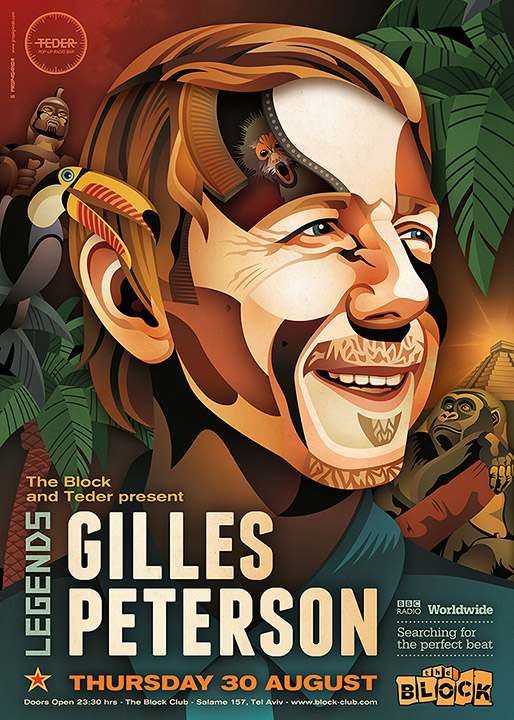 Description | Promotional artwork for an electronic music event in Tel Aviv (Israel). Guest DJ: Gilles Peterson (BBC Radio, Worldwide :: London) performing solo all night long! |