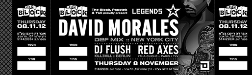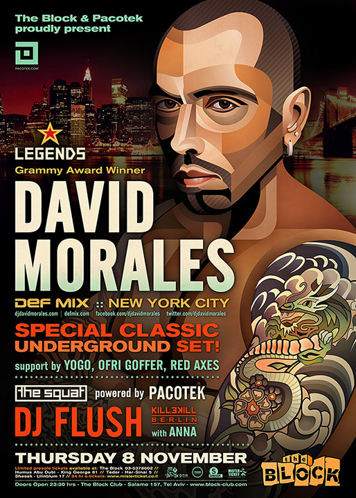 Description | Promotional artwork for an electronic music event in Tel Aviv (Israel). Guests: David Morales (Def Mix :: New York City). Special Classic Underground Set! Support by Yogo, Ofri Goffer, Red Axes The Squat (powered by Pacotek): DJ Flush (Killekill :: Berlin) & Anna |