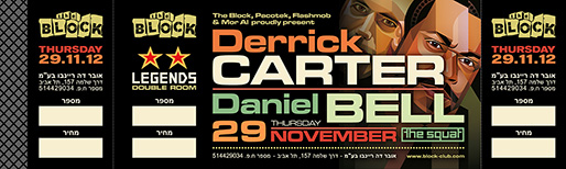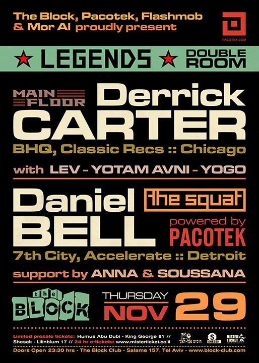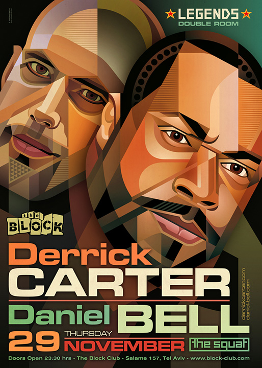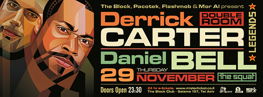 Description | Promotional artwork for an electronic music event in Tel Aviv (Israel). LEGENDS - Double Room Main Floor: Derrick Carter (BHQ, Classic Records :: Chicago). The Squat (powered by Pacotek): Daniel Bell (7th City, Accelerate :: Detroit). Support by Anna & Soussana |
