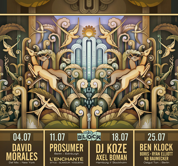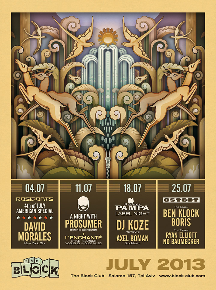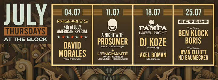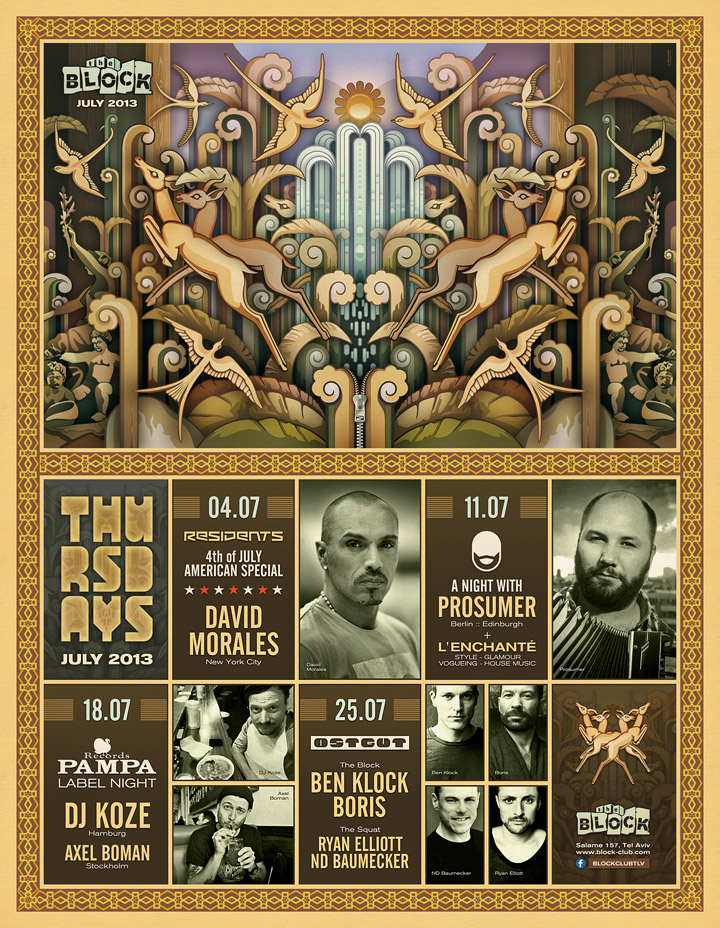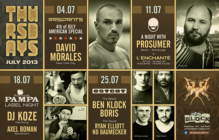 Description | Promotional artwork for the July 2013 schedule of The Block club, Tel Aviv (Israel). 04.07 - Residents / 4th of July American Special with DAVID MORALES (NYC) 11.07 - A night with PROSUMER (Berlin :: Edinburgh) + L'ENCHANTÉ 18.07 - Pampa Label Night with DJ KOZE (Hamburg), AXEL BOMAN (Stockholm) 25.07 - Ostgut Nacht: BEN KLOCK, BORIS, RYAN ELLIOTT, ND BAUMECKER |