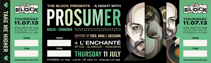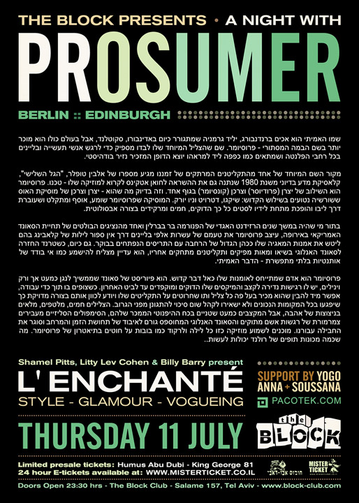 Description | Promotional artwork for an electronic music event in Tel Aviv (Israel). Guest DJ: PROSUMER (Berlin :: Edinburgh) + a performance from L'ENCHANTÉ (Style - Glamour - Vogueing) support by Anna & Soussana, Yogo |