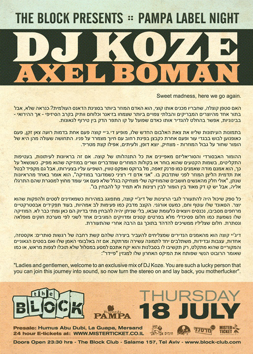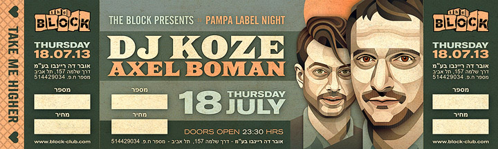 Description | Promotional artwork for an electronic music event in Tel Aviv (Israel). Guest DJs: DJ KOZE (Hamburg), AXEL BOMAN (Stockholm) |