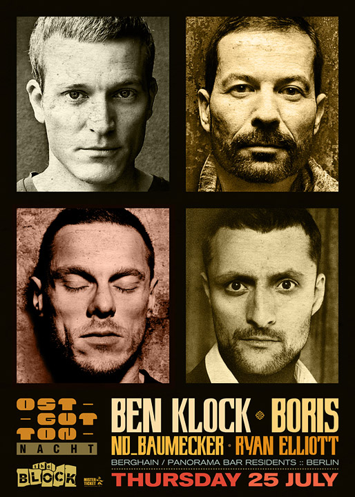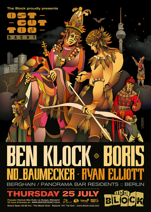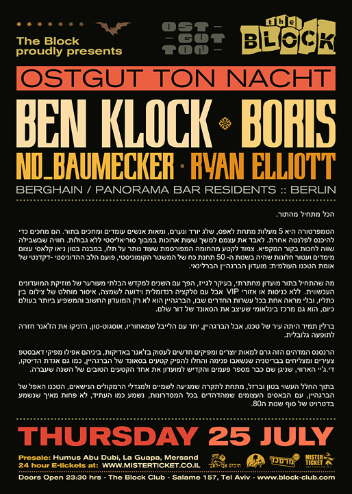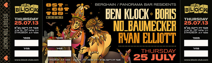 Description | Promotional artwork for an electronic music event in Tel Aviv (Israel). The Block introduces a collaboration with Ostgut Ton, Berlin's finest techno output and owner of the legendary club Berghain / Panorama Bar. Guest DJs: BEN KLOCK // BORIS // ND_BAUMECKER // RYAN ELLIOTT |