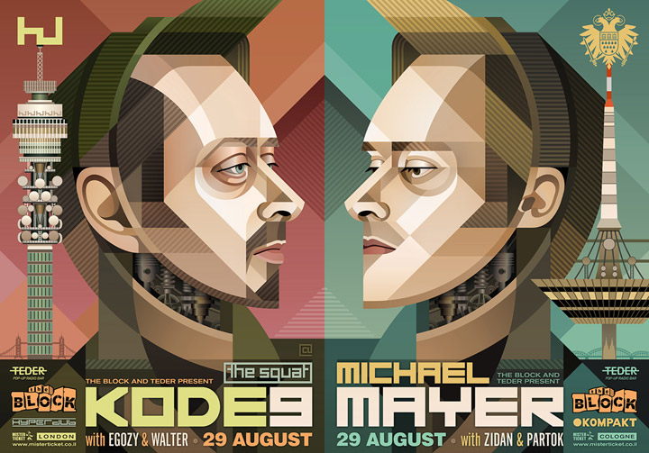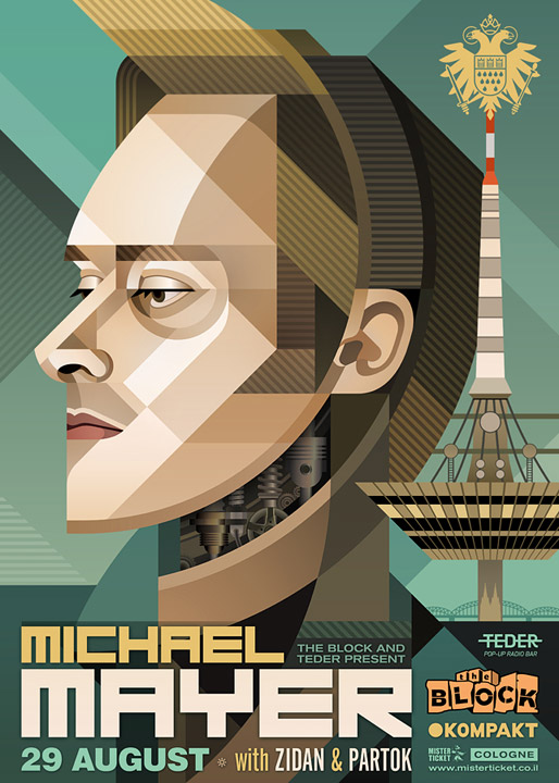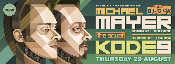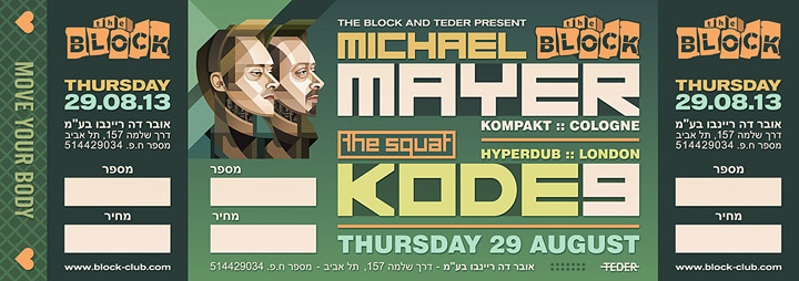Description | Promotional artwork for an electronic music event in Tel Aviv (Israel). Main Floor: MICHAEL MAYER (Kompakt :: Cologne) Support by Zidan & Partok. The Squat (presented by Teder): KODE9 (HyperDub :: London). Support by Egozy & Walter. |
