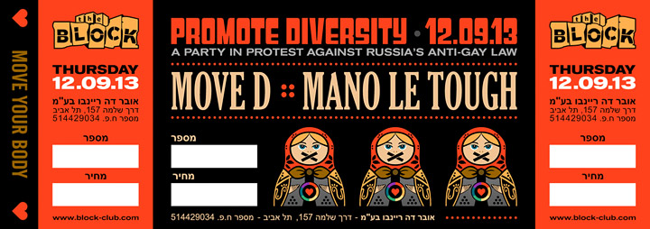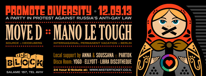 Description | Promotional artwork for an electronic music event in Tel Aviv (Israel). Guest DJs: MOVE D (Source :: Heidelberg) MANO LE TOUGH (Internasjonal, Permanent Vacation :: Berlin). Support by Anna & Soussana, Partok. Disco Room: Yogo, Ellyott, Libra Discotheque. |