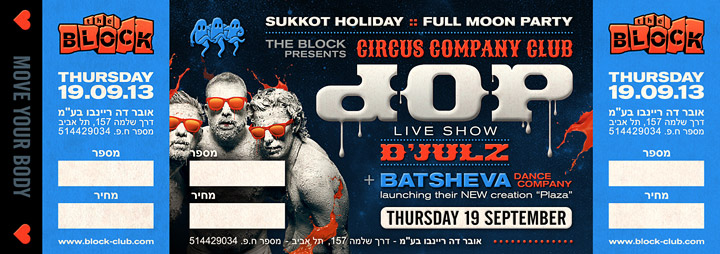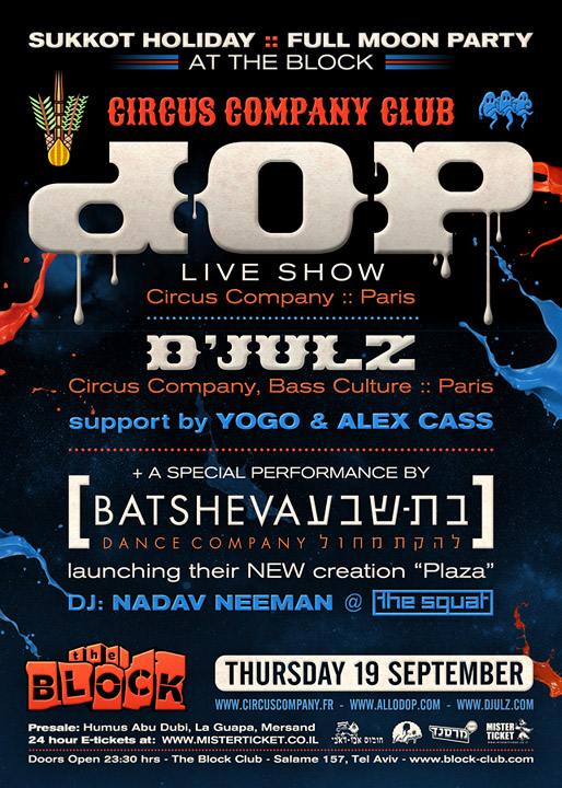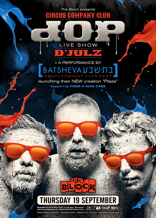 Description | Promotional artwork for an electronic music event in Tel Aviv (Israel). Guest DJs: dOP (Circus Company :: Berlin / Barcelona) D'JULZ (Circus Company :: Paris, NYC). Support by Yogo & Alex Cass. The Squat: A special performance by BATSHEVA Dance Company. DJ Set by Nadav Neeman. |