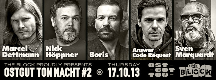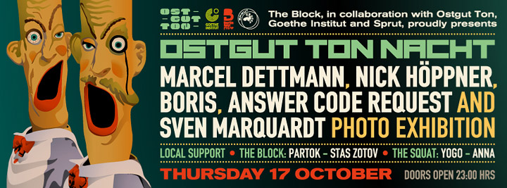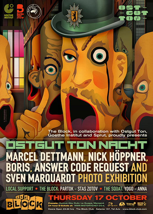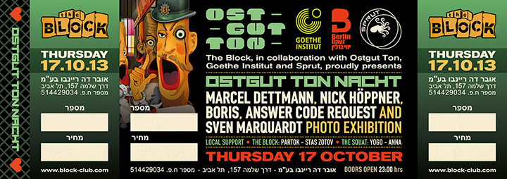 Description | Promotional artwork for an electronic music event in Tel Aviv (Israel). Presented by The Block, in collaboration with Ostgut Ton, Goethe Institut and Sprut. Guest DJs: MARCEL DETTMANN NICK HĂ–PPNER BORIS ANSWER CODE REQUEST Local Support: The Block // Partok, Stas Zotov The Squat // Yogo, Anna |