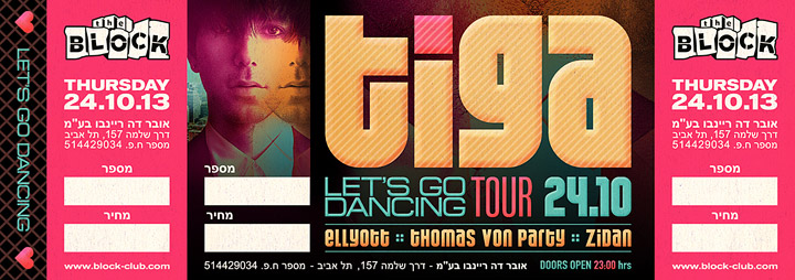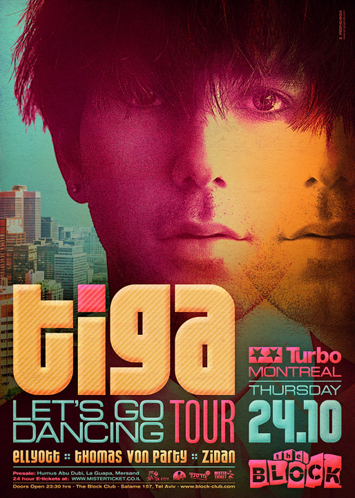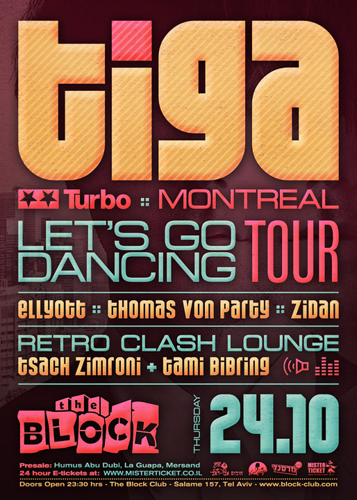 Description | Promotional artwork for an electronic music event in Tel Aviv (Israel). Guest DJ: TIGA (Turbo :: Montreal) Support by: Ellyott, Thomas Von Party, Zidan. |