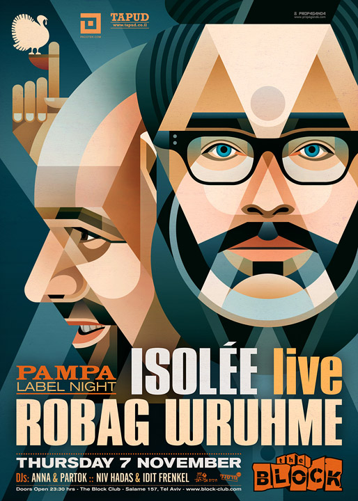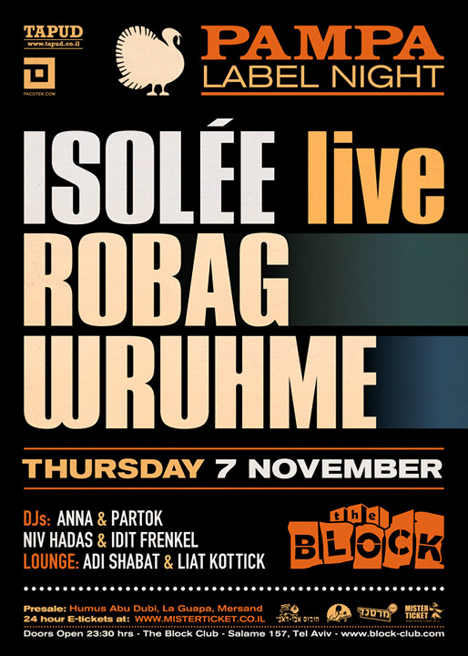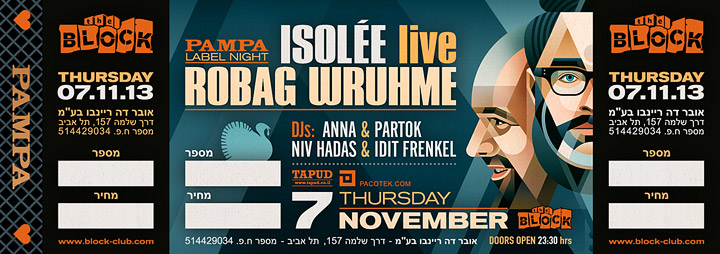 Description | Promotional artwork for an electronic music event in Tel Aviv (Israel). Guest DJs: ISOLÉE LIVE (Berlin) ROBAG WRUHME (Jena) Support by: Anna, Partok, Niv Hadas, Idit Frenkel |