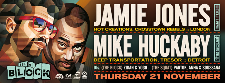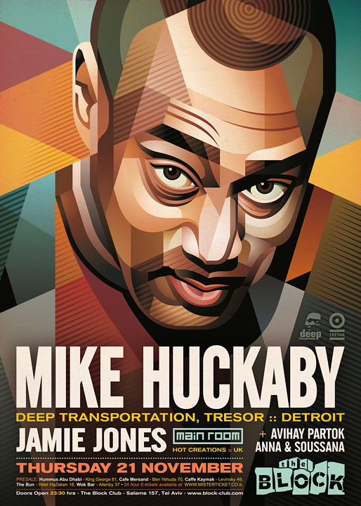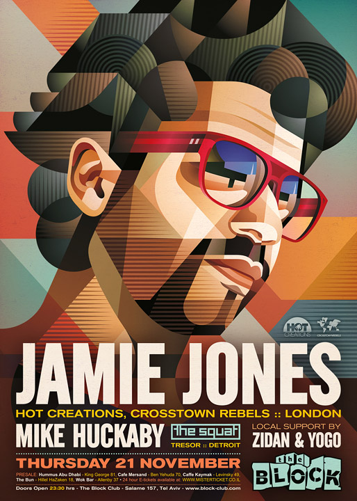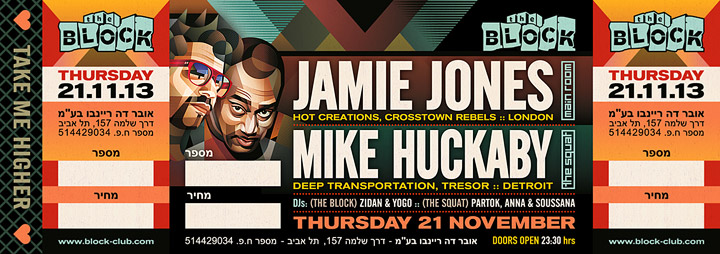 Description | Promotional artwork for an electronic music event in Tel Aviv (Israel). Guest DJs: JAMIE JONES (Hot Creations, Crosstown Rebels :: London) MIKE HUCKABY (Deep Transportation, Tresor :: Detroit) Support by: Zidan, Yogo // Partok, Anna & Soussana |