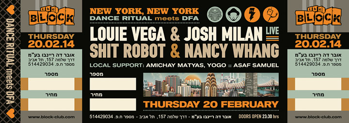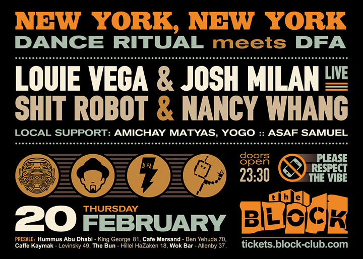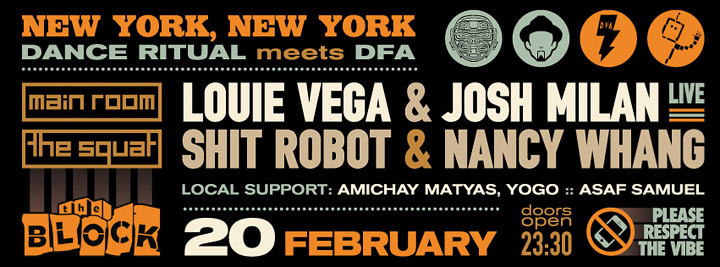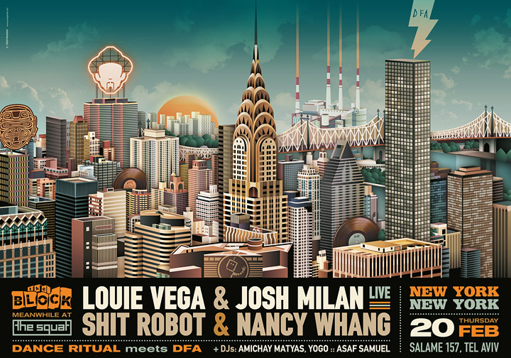 Description | Promotional artwork for an electronic music event in Tel Aviv (Israel). Guest DJs: LOUIE VEGA (Masters At Work :: NYC) JOSH MILAN LIVE (HoneyComb, Vega :: NYC) SHIT ROBOT (DFA :: NYC) NANCY WHANG (DFA, LCD Soundsystem :: NYC) Support by: Amichay Matyas, Yogo // Asaf Samuel |