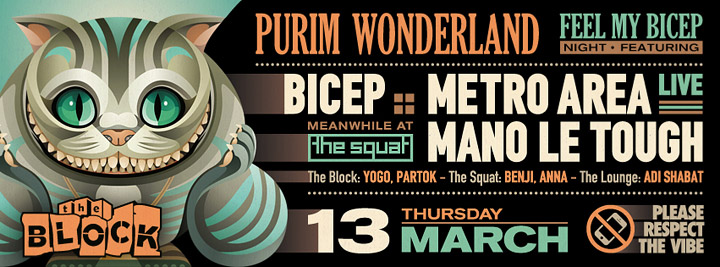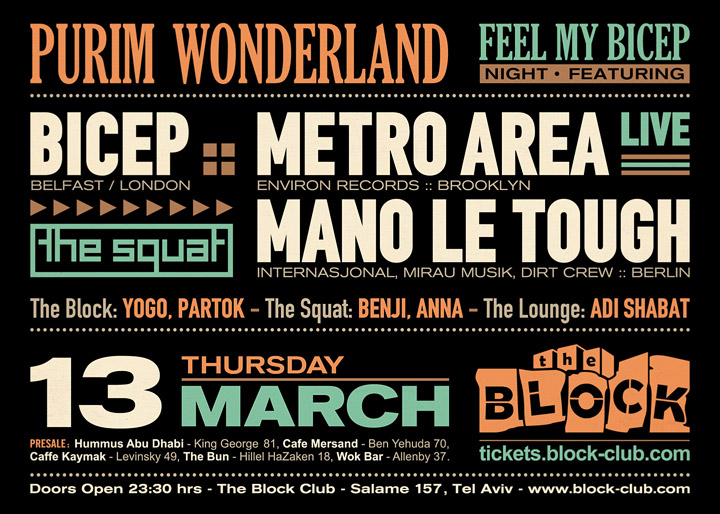 Description | Promotional artwork for an electronic music event in Tel Aviv (Israel). Guest DJs: BICEP (Feel My Bicep :: Belfast, London) METRO AREA LIVE (Environ Records :: Brooklyn) MANO LE TOUGH (Internasjonal, Mirau Musik :: Berlin) Support by: Yogo, Partok // Benji, Anna // Adi Shabat |