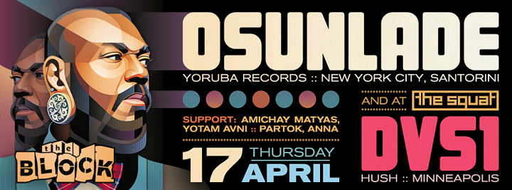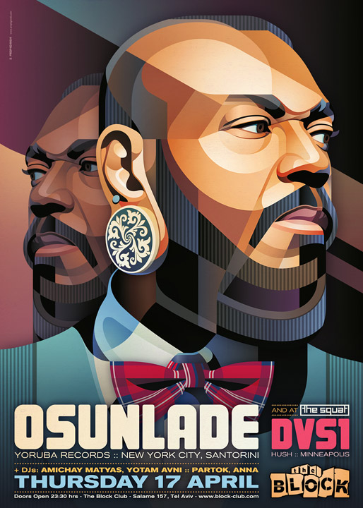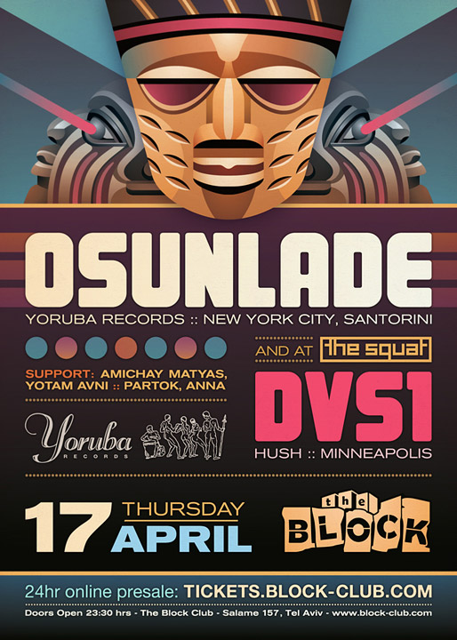 Description | Promotional artwork for an electronic music event in Tel Aviv (Israel). Guest DJs: OSUNLADE (Yoruba Records :: NYC, Santorini) DVS1 (Hush :: Minneapolis) Support by: Amichay Matyas, Yotam Avni :: Partok, Anna |