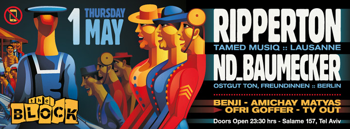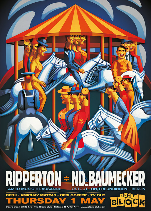 Description | Promotional artwork for an electronic music event in Tel Aviv (Israel). Guest DJs: RIPPERTON (Tamed Musiq :: Lausanne) ND BAUMECKER (Ostgut Ton, Freundinnen :: Berlin) Support by: Benji, Amichay Matyas // Ofri Goffer, TV OUT Artwork: Remake of "Merry-Go-Round" by Mark Gertler, 1916 |