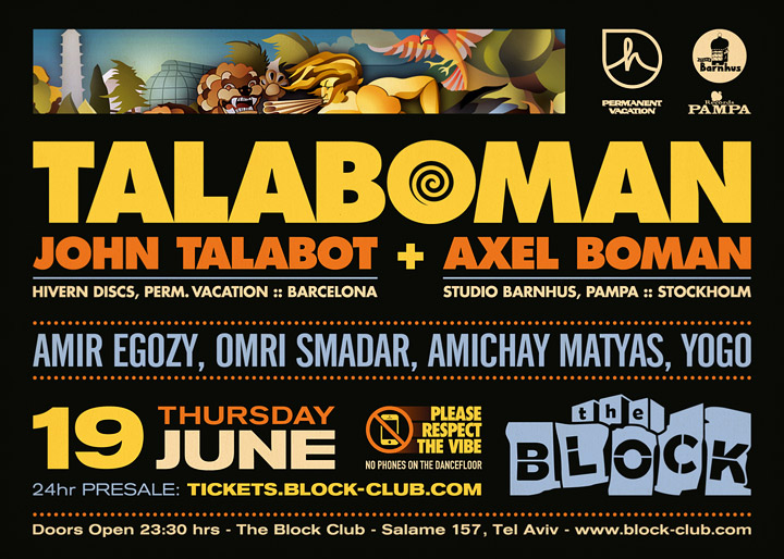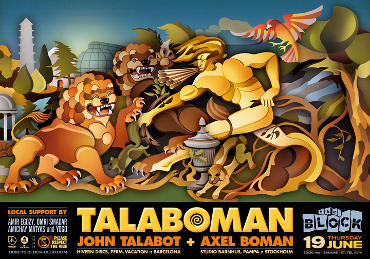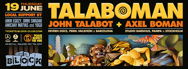 Description | Promotional artwork for an electronic music event in Tel Aviv (Israel). Guest DJs: JOHN TALABOT (Hivern Discs, Perm.Vacation :: Barcelona) AXEL BOMAN (Studio Barnhus, Pampa :: Stockholm) Support by: Amir Egozy, Omri Smadar, Amichay Matyas, Yogo |