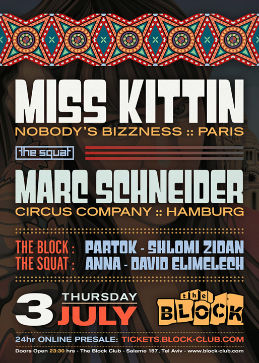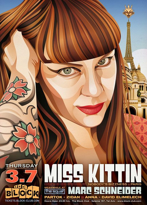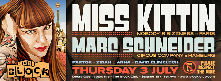 Description | Promotional artwork for an electronic music event in Tel Aviv (Israel). Guest DJs: MISS KITTIN (Nobody's Bizzness :: Paris) MARC SCHNEIDER (Circus Company :: Hamburg) Support by: Partok, Shlomi Zidan // Anna, David Elimelech |