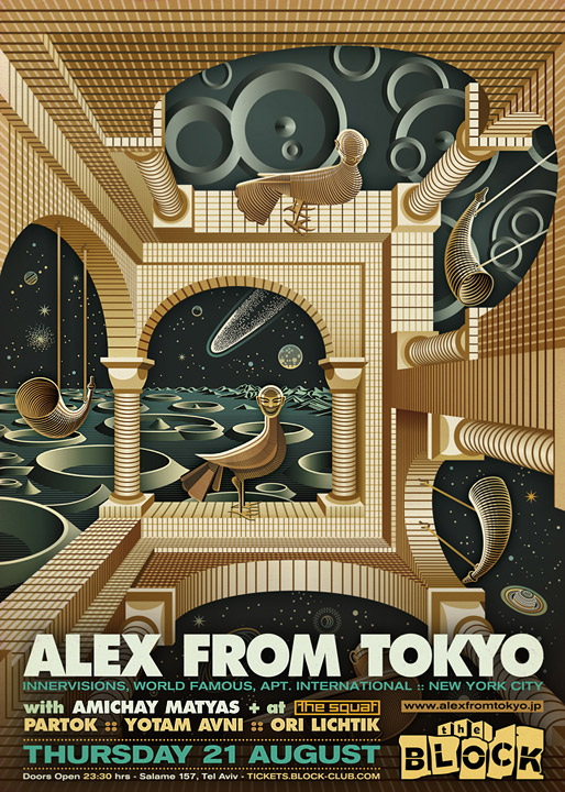 Description | Promotional artwork for an electronic music event in Tel Aviv (Israel). Guest DJ: ALEX FROM TOKYO (Innervisions, World Famous :: NYC) Amichay Matyas // Partok, Yotam Avni, Ori Lichtik Artwork: Remake of "Another World II" by M.C. Escher, 1947. |