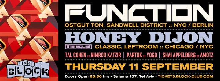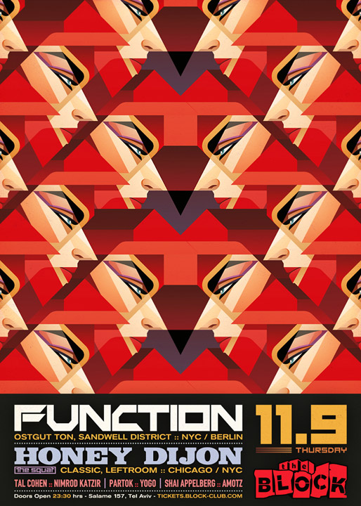 Description | Promotional artwork for an electronic music event in Tel Aviv (Israel). Guest DJs: FUNCTION (Ostgut Ton, Sandwell District :: NYC, Berlin) HONEY DIJON (Classic, Leftroom :: Chicago, NYC) Tal Cohen, Nimrod Katzir // Partok, Yogo // Shai Appelberg, Amotz |