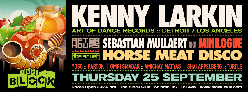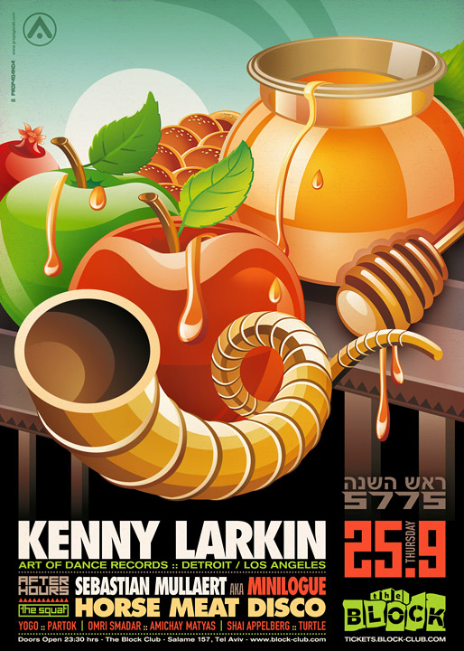 Description | Promotional artwork for an electronic music event in Tel Aviv (Israel). Guest DJs: KENNY LARKIN (Art Of Dance :: Detroit, LA) SEBASTIAN MULLAERT aka MINILOGUE (Mule Musiq :: Stockholm) HORSE MEAT DISCO (!K7, Strut :: London) Yogo, Partok // Omri Smadar, Amichay Matyas // Shai Appelberg, Turtle |