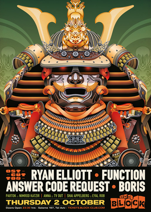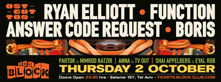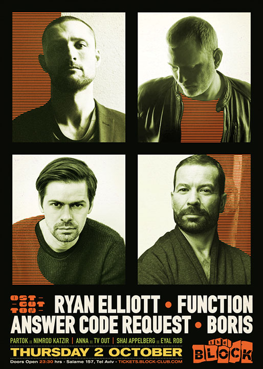 Description | Promotional artwork for an electronic music event in Tel Aviv (Israel). Guest DJs: RYAN ELLIOTT (Ostgut Ton :: Berlin) FUNCTION (Ostgut Ton :: Berlin) ANSWER CODE REQUEST (Ostgut Ton :: Berlin) BORIS (Ostgut Ton :: Berlin) Partok, Nimrod Katzir // Anna, TV OUT // Shai Appelberg, Eyal Rob |