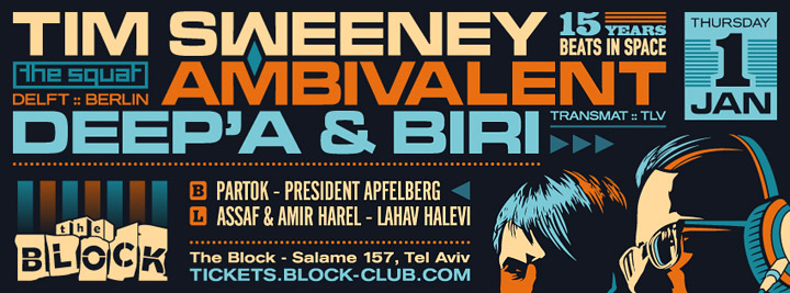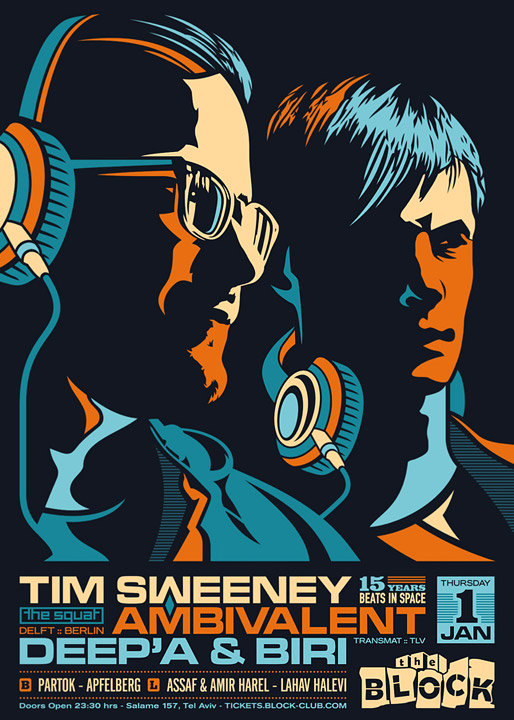 Description | Promotional artwork for an electronic music event in Tel Aviv (Israel). Guest DJs: TIM SWEENEY (Beats In Space, DFA :: New York City) AMBIVALENT (Delft, M-nus, Ovum :: Berlin) DEEP'A & BIRI (Black Crow, Transmat :: Tel Aviv) Partok, President Apfelberg // Assaf & Amir Harel, Lahav Halevi |