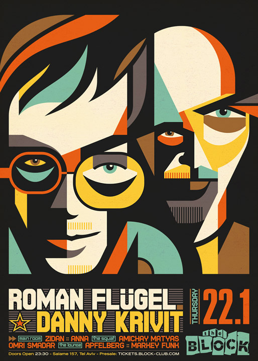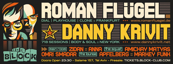 Description | Promotional artwork for an electronic music event in Tel Aviv (Israel). Guest DJs: ROMAN FLÜGEL (Playhouse :: Frankfurt) DANNY KRIVIT (Body & Soul, 718 Sessions :: NYC) Main Room: Zidan - Anna The Squat: Amichay Matyas - Omri Smadar The Lounge: Apfelberg - Markey Funk |