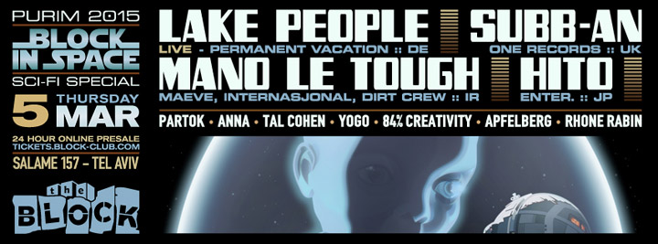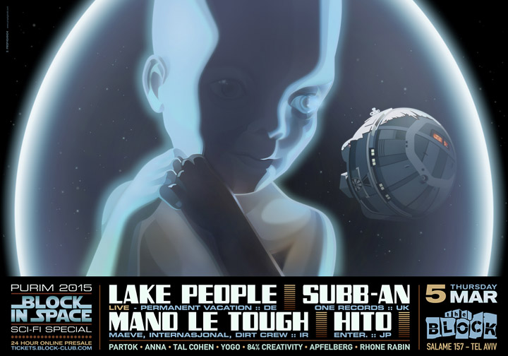 Description | Promotional artwork for an electronic music event in Tel Aviv (Israel). Guest DJs: LAKE PEOPLE LIVE (Permanent Vacation :: DE) SUBB-AN (One Records :: UK) MANO LE TOUGH (Maeve, Internasjonal :: IR) HITO (Enter :: JP) Partok - Anna - Tal Cohen - Yogo - 84% Creativity - Apfelberg - Rhone Rabin |