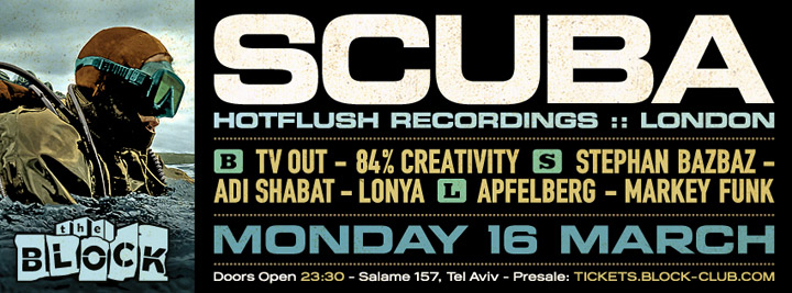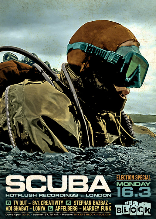 Description | Promotional artwork for an electronic music event in Tel Aviv (Israel). Guest DJ: SCUBA (Hotflush Recordings :: London) The Block: TV OUT - 84% Creativity The Squat: Stephan Bazbaz - Adi Shabat - Lonya The Lounge: Apfelberg - Markey Funk |