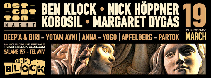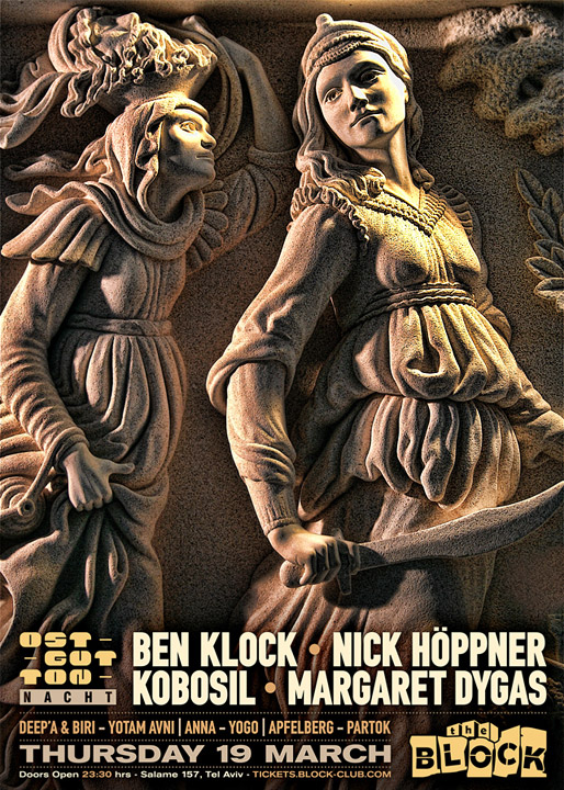 Description | Promotional artwork for an electronic music event in Tel Aviv (Israel). Guest DJs: BEN KLOCK (Ostgut Ton :: Berlin) NICK HĂ–PPNER (Ostgut Ton :: Berlin) KOBOSIL (Ostgut Ton :: Berlin) MARGARET DYGAS (Ostgut Ton :: Berlin) The Block: Deep'a & Biri - Yotam Avni The Squat: Anna - Yogo The Lounge: Apfelberg - Partok |