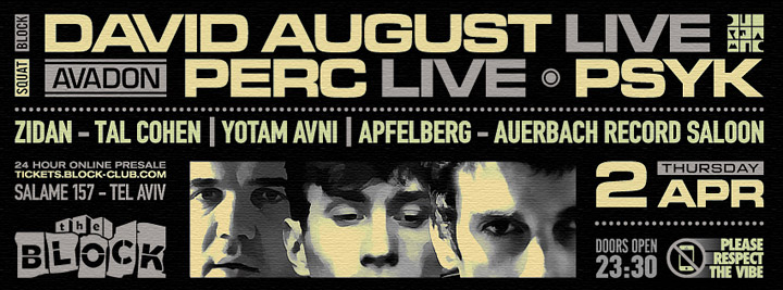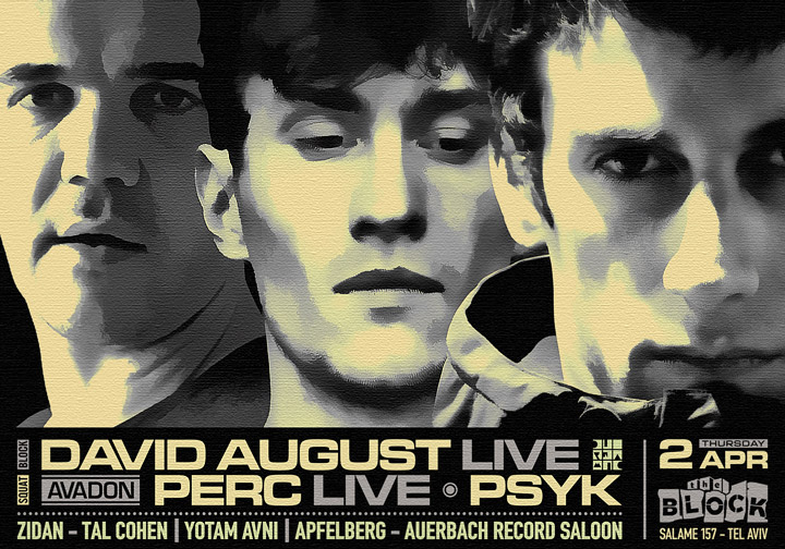 Description | Promotional artwork for an electronic music event in Tel Aviv (Israel). Guest DJs: DAVID AUGUST LIVE (Diynamic, Innervisions :: Berlin) PERC LIVE (Perc Trax, Kompakt, Ovum :: London) PSYK (Mote Evolver, Non Series :: Madrid) The Block: Zidan - Tal Cohen The Squat: Yotam Avni The Lounge: Apfelberg - Auerbach Record Saloon |