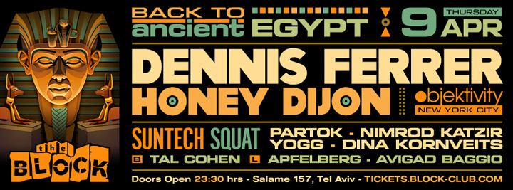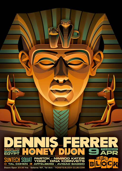 Description | Promotional artwork for an electronic music event in Tel Aviv (Israel). Guest DJs: DENNIS FERRER (Objektivity :: New York City) HONEY DIJON (Classic :: Chicago, NYC) The Block: Tal Cohen Suntech Squat: Partok - Nimrod Katzir - Yogg - Dina Kornveits The Lounge: Apfelberg - Avigad Baggio |