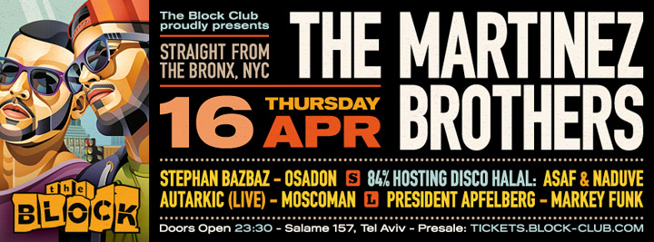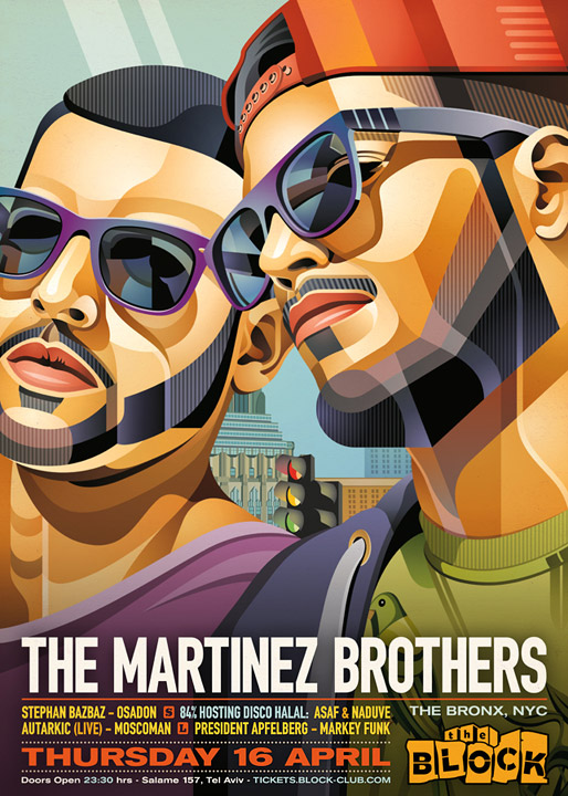 Description | Promotional artwork for an electronic music event in Tel Aviv (Israel). Guest DJs: THE MARTINEZ BROTHERS (Objektivity :: The Bronx) The Block: Stephan Bazbaz - Osadon The Squat: 84% Hosting Disco Halal: Asaf & Naduve - Autarkic LIVE - Moscoman The Lounge: President Apfelberg - Markey Funk |