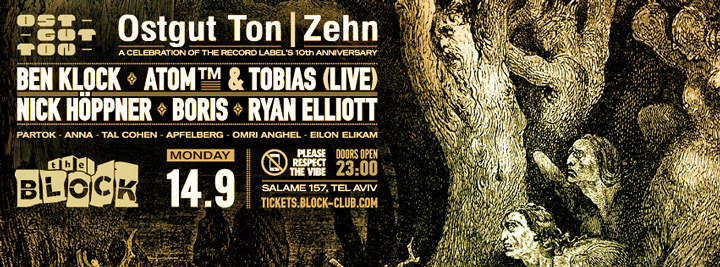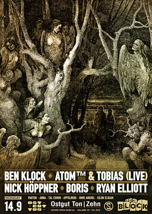 Description | Promotional artwork for an electronic music event in Tel Aviv (Israel). Guest DJs: BEN KLOCK (Ostgut Ton :: Berlin) ATOM™ & TOBIAS LIVE (Ostgut Ton :: Berlin) NICK HÖPPNER (Ostgut Ton :: Berlin) BORIS (Ostgut Ton :: Berlin) RYAN ELLIOTT (Ostgut Ton :: Berlin) Partok - Anna - Tal Cohen - Apfelberg - Omri Anghel - Eilon Elikam |
