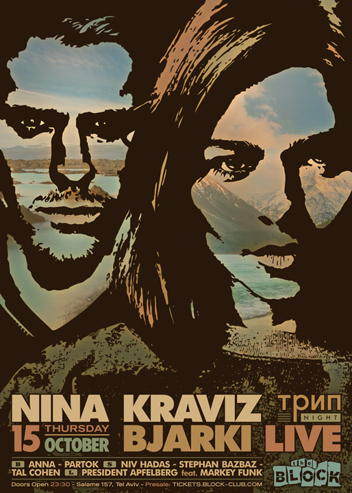 Description | Promotional artwork for an electronic music event in Tel Aviv (Israel). Guest DJs: NINA KRAVIZ (трип :: Moscow) BJARKI (трип :: Reykjavik) The Block: Anna - Partok The Squat: Niv Hadas - Stephan Bazbaz - Tal Cohen The Lounge: President Apfelberg - Markey Funk |