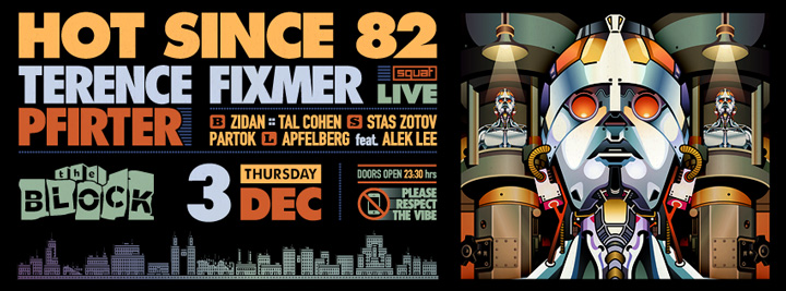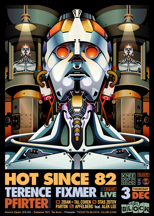 Description | Promotional artwork for an electronic music event in Tel Aviv (Israel). Guest DJs: HOT SINCE 82 (Knee Deep :: Yorkshire) TERENCE FIXMER (CLR, Electric Deluxe :: Lille) PFIRTER (CLR, Mindtrip :: Buenos Aires) The Block: Zidan - Tal Cohen The Squat: Stas Zotov - Partok The Lounge: Apfelberg - Alek Lee |
