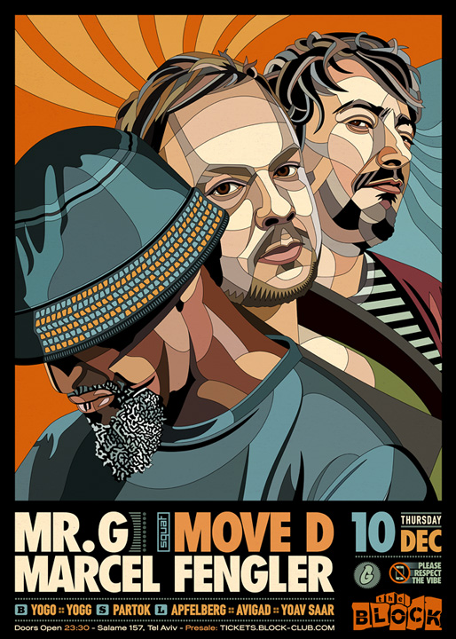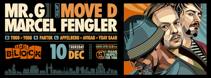 Description | Promotional artwork for an electronic music event in Tel Aviv (Israel). Guest DJs: MR. G (Phoenix G, Rekids :: UK) MOVE D (Smallville, Workshop :: Heidelberg) MARCEL FENGLER (Ostgut Ton :: Berlin) The Block: Yogo - Yogg The Squat: Partok The Lounge: Apfelberg - Avigad - Yoav Saar |